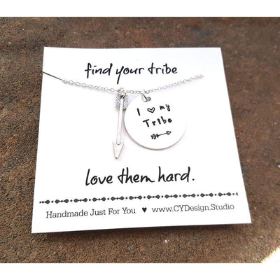 This necklace is handcrafted featuring an aluminum pendant hand-stamped with "I love my tribe" and hand-painted to enhance the letters. Adorned by a silver pewter arrow charm. Necklace made with an 18-inch shiny sterling silver cable chain with secure spring ring closure. *necklace insert card included. The aluminum pendant will never rust or tarnish.