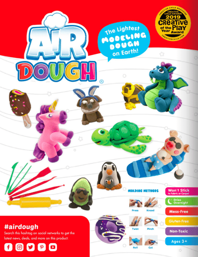 Have you heard of Air Dough? Air Dough is the lightest, most amazing dough on Earth! Your average play dough sticks everywhere...not Air Dough! It dries airy light and gives your child a chance to explore their creativity. What are you waiting for? Try the Air Dough today. This Air Sweet Treats kit contains 6 vibrant colors, 6 basic tools, and instructions!