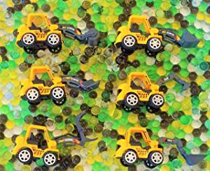 - Dew drops Construction Zone Includes 4 ounces of Earth Colored Sensory Water Beads with 6 Different Tractor Toys Included. The specifically designed 4 color-coordinated beads are Light Green, Yellow, Black, and Transparent.